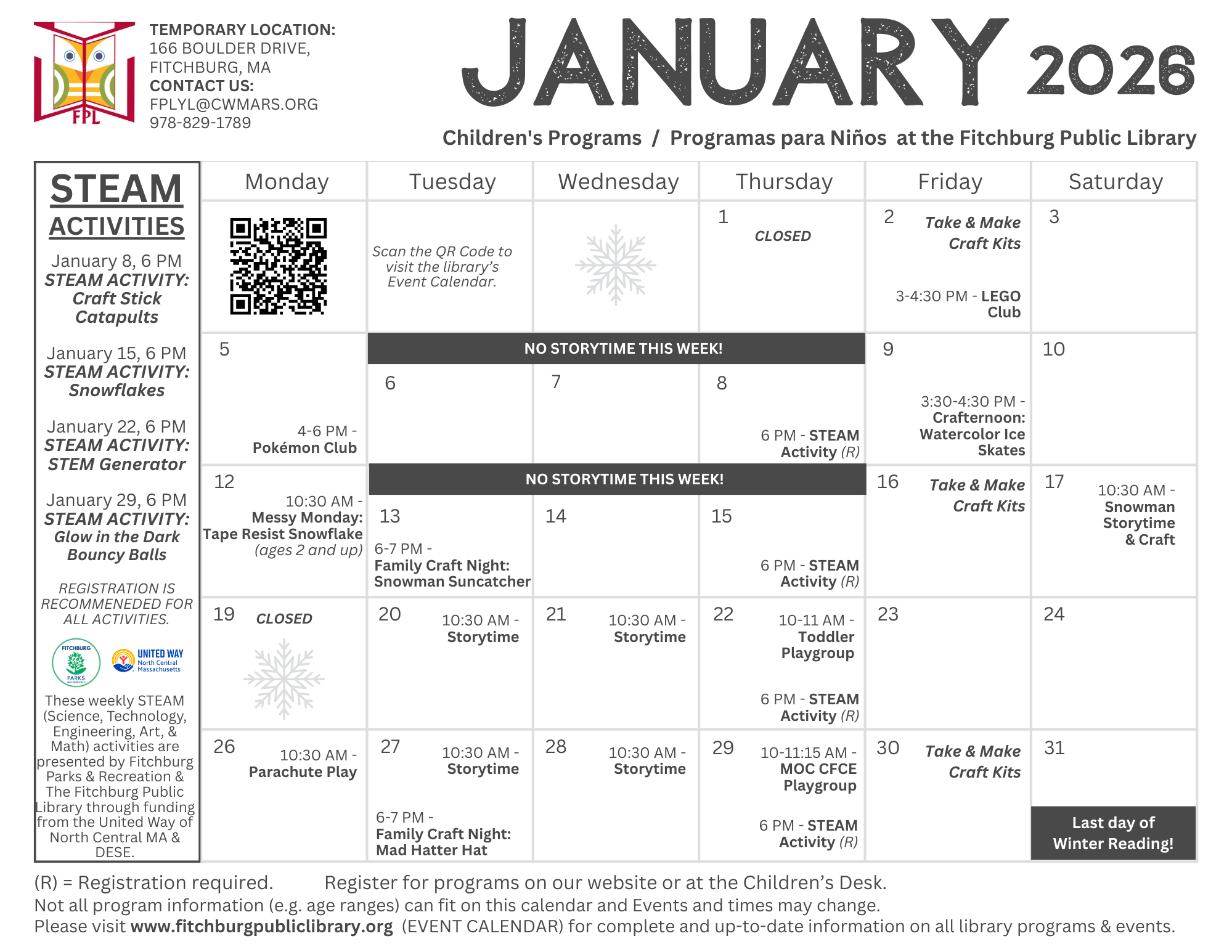 We are pleased to announce that the library's temporary location is now fully open and operational for all. Please come and visit us at 166 Boulder Drive, Suite 108 (look for our sign)!
